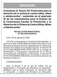 Resolución Ministerial N°383-2025-MINEDU, Actualización de Protocolos para la atención de casos de Violencia contra estudiantes.